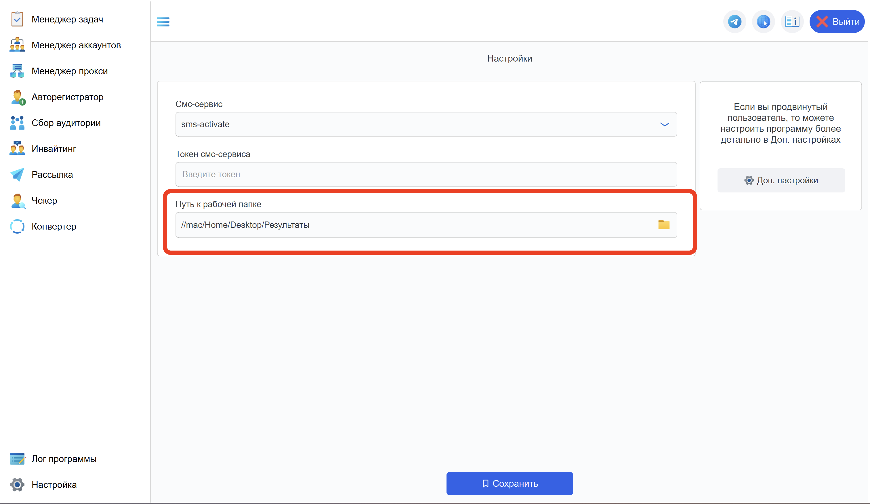 2. Заходим в настройки и указываем рабочую папку. Которую только что создали.