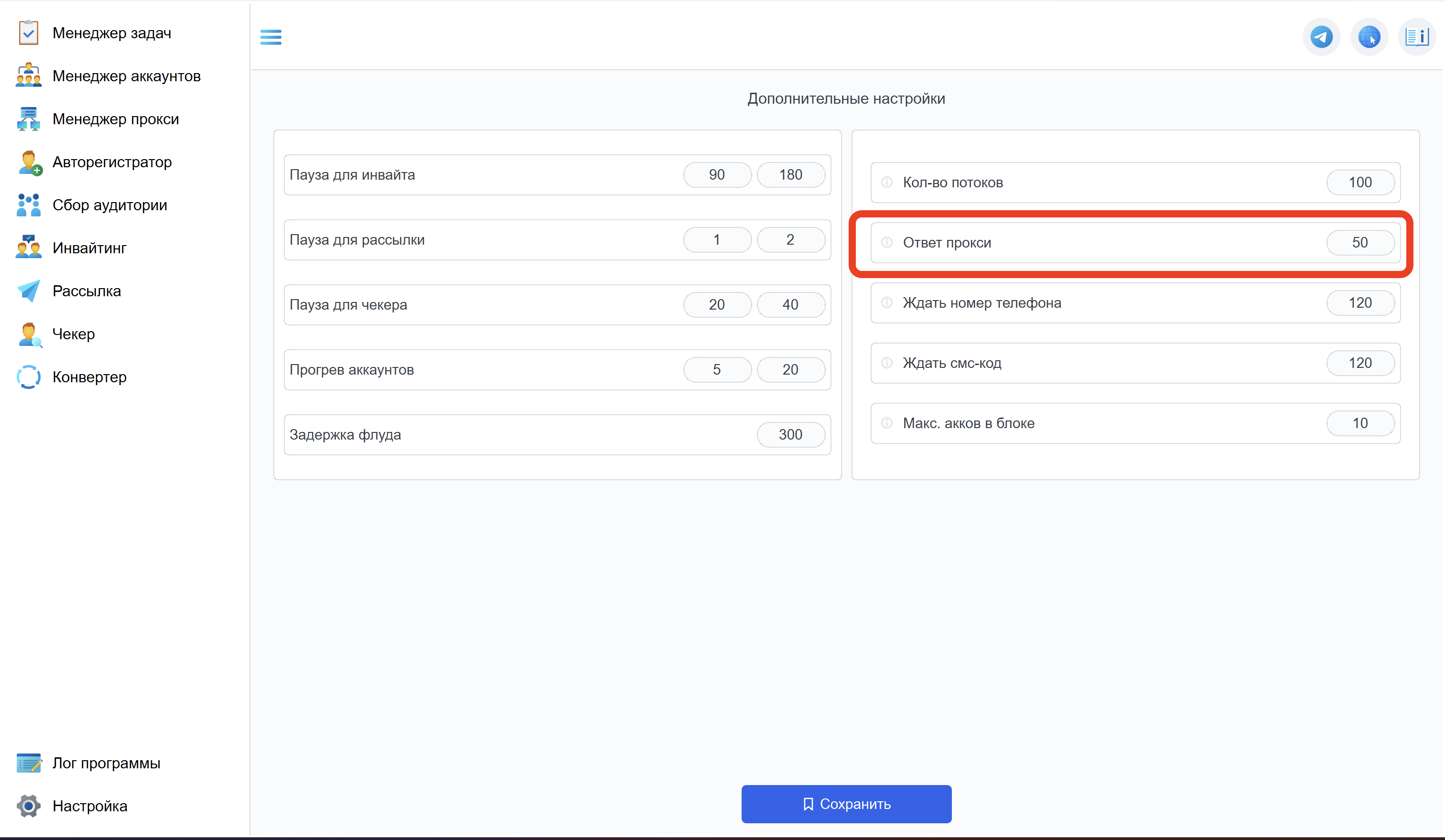 5. В "Дополнительных настройках" ставите "Ответ прокси" - 50 сек.